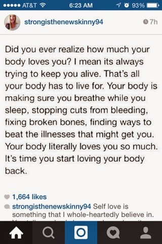 Love yourself! We can get so down on ourselves and negative, but we need to learn to appreciate what we have. Today I am grateful for my strong legs that allow me to walk and do fun things. Tell yourself one positive thing about your body today and try to keep it up daily!