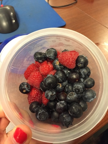 This is one of my snacks. Fresh berries with two boiled eggs topped with pink Himalayan sea salt.
